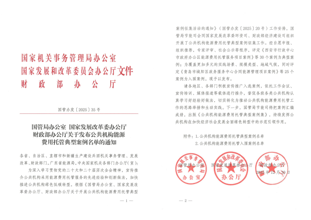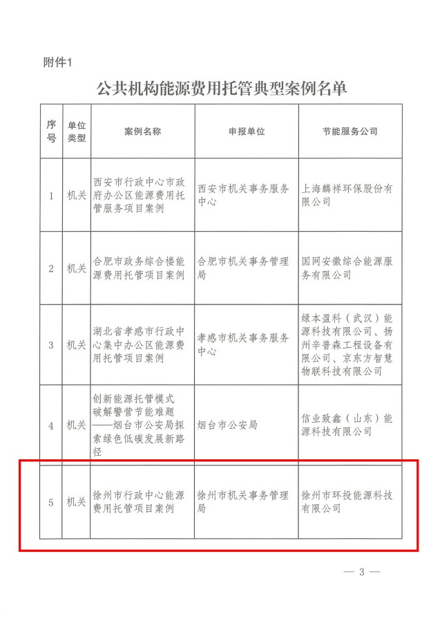 近日,國管局辦公室、國家發(fā)展改革委辦公廳、財政部辦公廳聯(lián)合發(fā)文,發(fā)布全國公共機構能源費用托管30個典型案例和25個入圍案例名單,徐州市環(huán)投能源科技有限公司(簡稱“環(huán)投公司”)托管服務的《徐州市行政中心能源費用托管項目》被評定為典型案例。